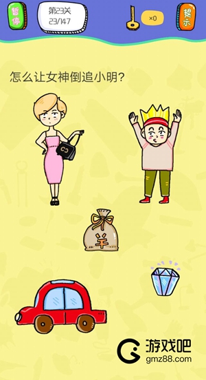 这一关的题目要求是“怎么让女神倒追小明”?答案:玩家只要拖走女神手上的包包(其他的物品都是误导玩家的),即可通关。