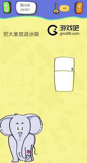 这一关中可以看到一个小冰箱和一只大象,题目要求是“把大象放进冰箱”。答案:玩家需要点住冰箱,然后拉大,即可过关。
