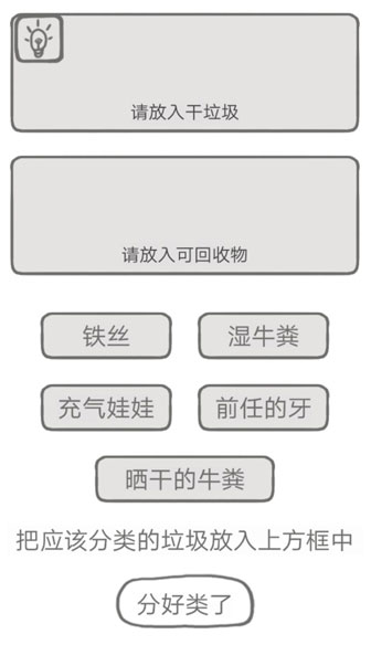 这一关玩家需要将铁丝、湿牛粪、充气娃娃、前任的牙、晒干的牛粪进行分类。