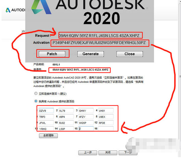 14:使用管理员身份打开注册机(一定要确保电脑是断开网络状态,也就是不能连接网络的模式),将申请号复制到“request”方框中,点击“patch”,点击“Generate”,计算机激活码,将计算出来的激活码复制到下面。点击“下一步”。