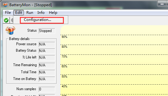 1、打开BatteryMon修复电池工具找到【Edit】按钮,找到Configuration...单击点进去。