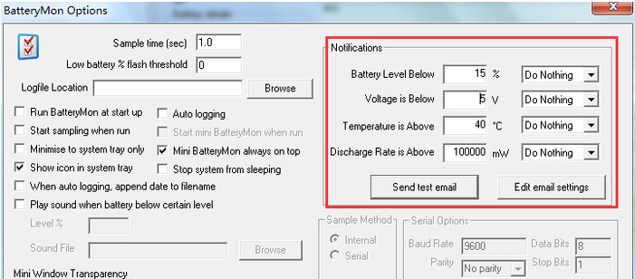 2、跳转至如下界面:用户根据图中所框选位置设置自己想要的数值,只要电池量低过你所设置参数标准时将会报警。(大家可根据参数后的单位对应该参数哦)