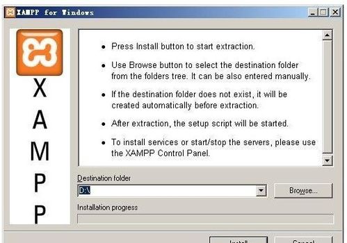 安装路径,最好放置到D盘,不建议不要放到系统盘去,尤其是早期的XAMPP版本可能默认安装Program files下可能在Vista、Windows 7可能需要修改写入权限。下图所示(只需要选择驱动器,安装程序会自动创建xampp目录),然后点install,等候安装完成。