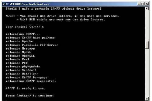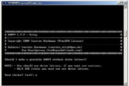 选择是否让xampp支持便携使用(无驱动器号),这里要注意,如果后面想把XAMPP注册为系统服务的话,是必须使用驱动器号的,如果要使用USB安装xampp就不能使用驱动器号,因为USB设备可能在不同PC机上的设备号可能有所变化。如下图。天缘安装的是到D盘,固定驱动器,所以就选N并回车。