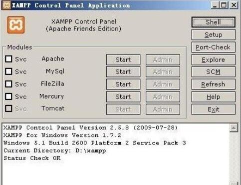 到这里xampp就安装完成了,如果出现xampp安装失败,请先运行安装一半的xampp目录下的卸载文件uninstall_xampp.bat执行一次清理,然后再重新安装。下面我们来看一下xampp的控制面板,如下图。图中,我们可以看到xampp 1.7.2的一些基本控制功能,注意不建议把这些功能注册为服务(开机启动),每次使用的时候自己就当个软件运行就可以了(桌面上已经有图标),这样在不使用XAMPP时更节省资源。也就是不要点左边的Svc前面的核选框。如果需要启动Apache或Mysql只需要点旁边的Start就可以了,然后就会显示已启动的running状态。(除非作为服务器长期使用才考虑注册服务)。