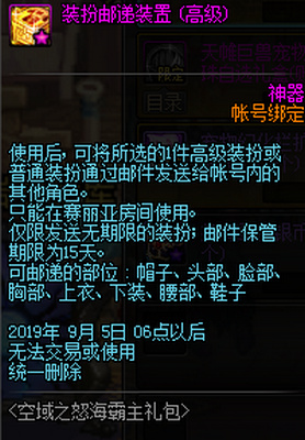 这个道具玩家在使用后,可以将所选择的1件高级装扮或者是普通装扮通过邮件的形式发送给账号内的其它角色。