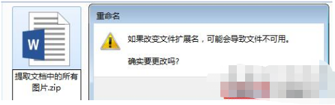 2、选中Word文档,按F2键,对文档重新命名,把扩展名【.docx】改为【.zip】,按回车键,弹出提示,点击【是】