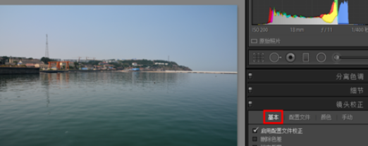 在lightroom镜头校正中选择基本,可以启用配置文件校正,并进行其它设置。