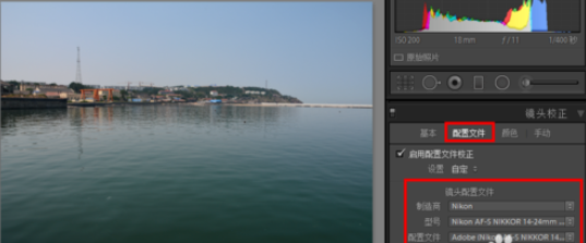 在lightroom镜头校正中选择配置文件,我们可以根据我们的使用的单反选择镜头的制造商和型号以及其配置文件,lightroom会自动进行校正。