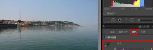 在lightroom镜头校正中选择颜色,我们可以对去边进行设置。