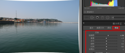 在lightroom镜头校正中选择手动,我们可以手动调节因单反镜头而导致的照片变形。