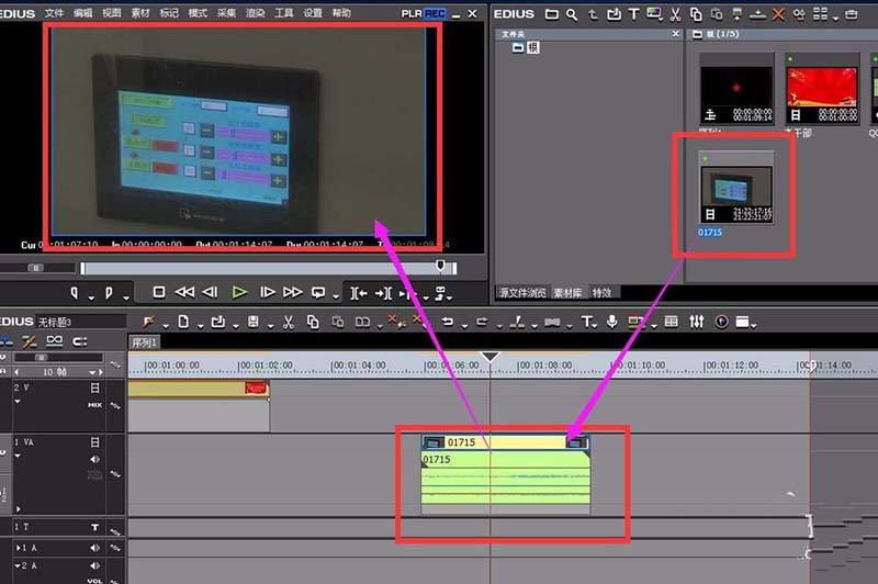 接着在EDIUS的素材库中,导入我们需要裁剪的视频。导入的视频素材拖入到时间线上。