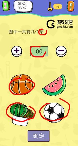 这一关的题目是“图中一共有几个球”?答案:玩家需要选择篮球、仙人掌、足球、两个0和“球”字,然后再点确定,即可过关。