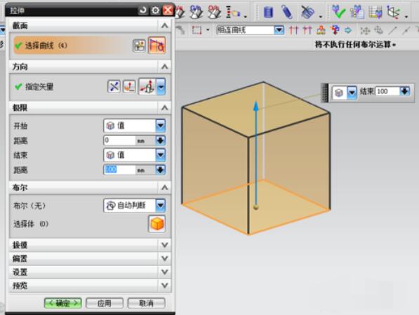 输入拉伸的范围数值(以草图所在平面为起点),距离起点多远开始拉伸到多远结束,然后点击确定即可(需预览可点击预览一栏的放大镜按钮)