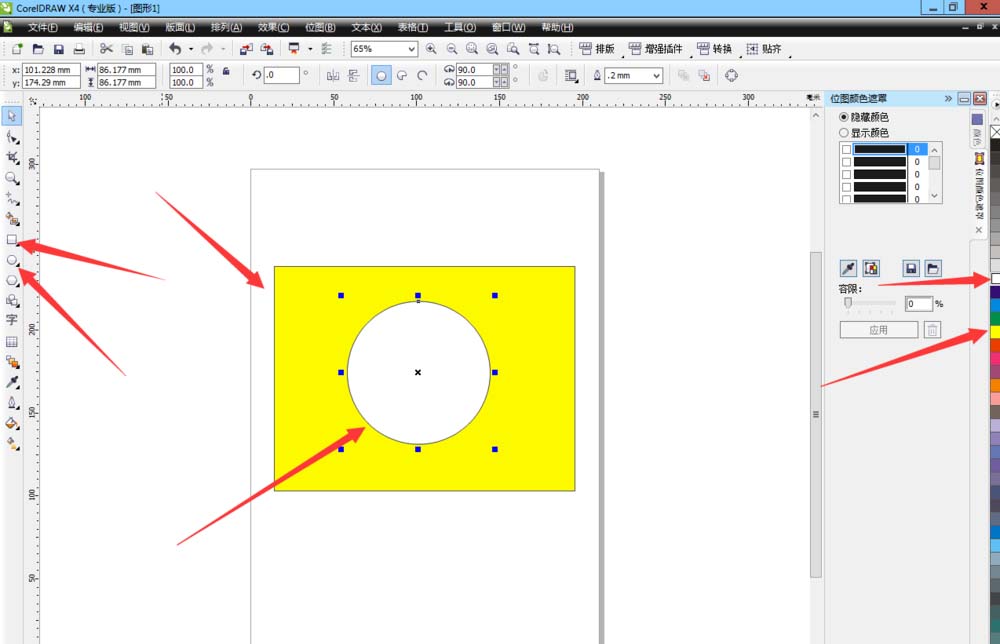 矩形工具绘制一个矩形并填充颜色,在单击圆形工具拉一个任意大小圆,填充白色。