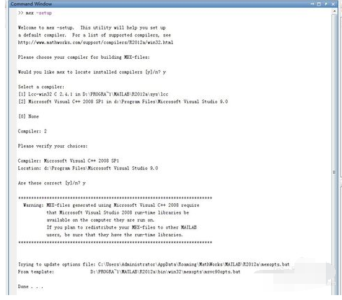 编译器的确定:打开MATLAB软件,在Command Window窗口下输入命令mbuild -setup,并根据提示选择合适的编译器,使用VC++6.0对C++连接环境的设置过程如下(当然如果您使用的是VS2008,设置过程一样):