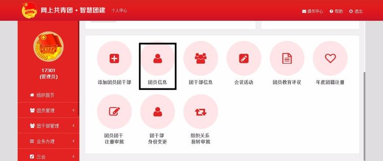 1、这是需要管理员设置的,不需要团员来操作。管理员登录账号,点击页面上面的“管理中心”。