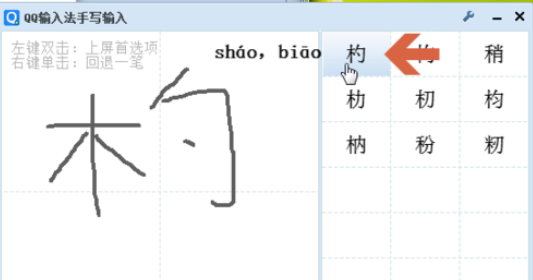 接下来在面板右侧会根据所划字的笔画自动列出可能的字。鼠标指针指向其中的字还会显示出拼音。