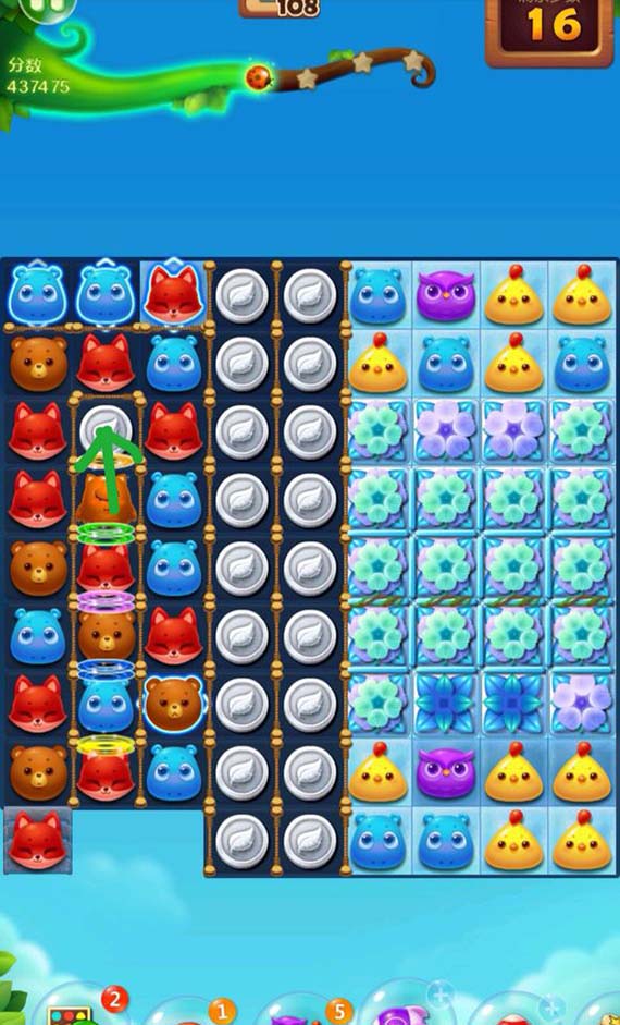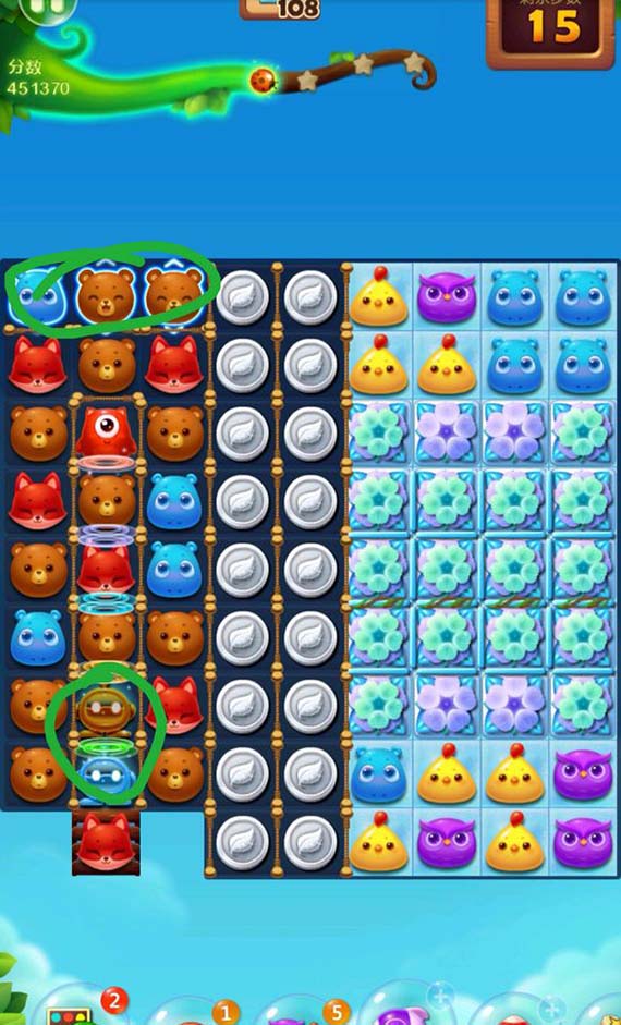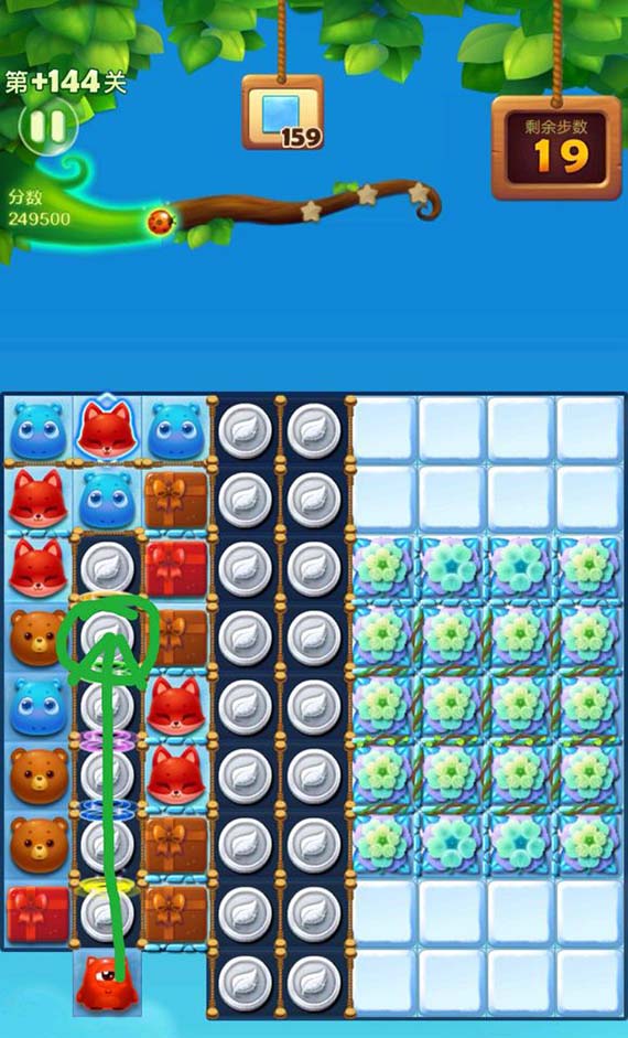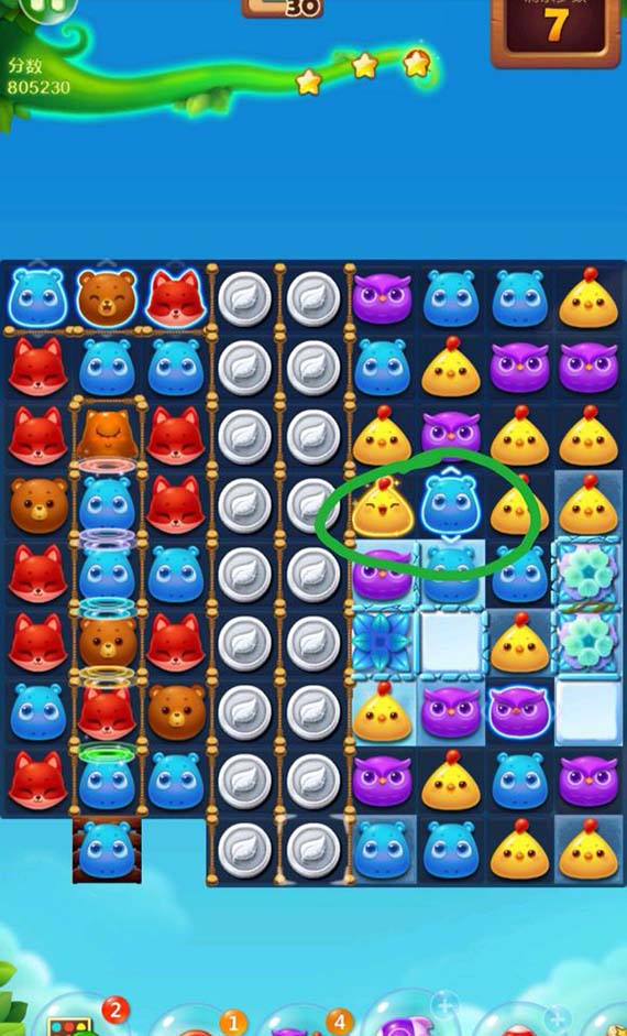 3.三消打左列或右列,目的是消除大眼仔下面的银币让两魔力鸟出现,然后双鸟交换打开右边局面