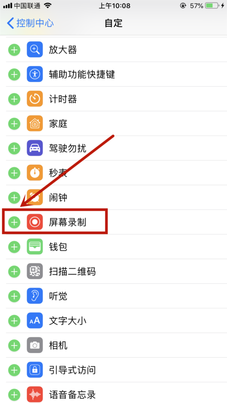5、用手按住iPhone8屏幕底部【向上轻扫】唤起【控制面板】后“用力按压”【屏幕录制】功能;