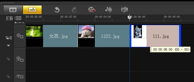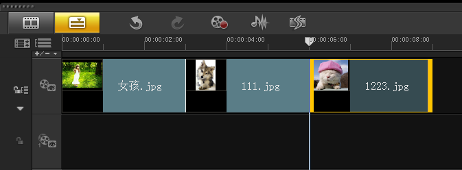 在时间轴视图的视频轨中,选择第一张照片与第二张照片之间的转场效果,如图所示: