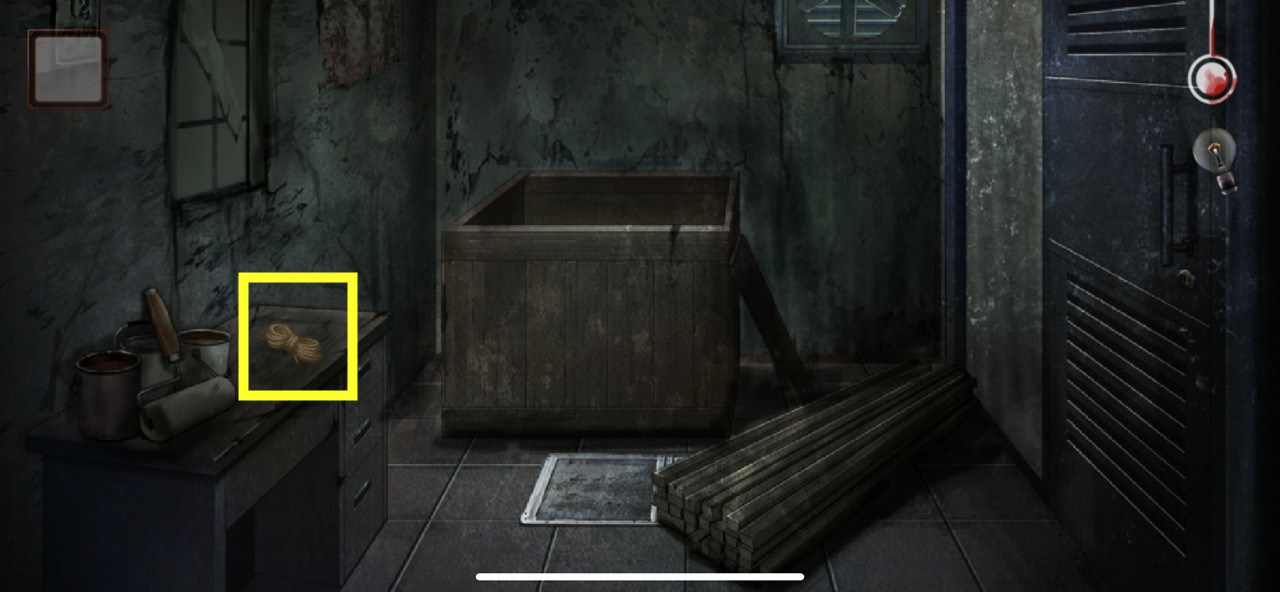 然后在桌上收集绳子,点击【绳子】和【两根木棍】合成道具,对铁门使用。