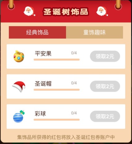 3、用户需要在规定时间内累计红包达到一定金额并完成圣诞树裝饰任务才可提现,如逾期未达到门槛,所累积的红包将会失效。若用户规定时间内累计红包达到一定金额,只需在活动结束前完成圣诞树装饰任务即可提现。活动结束后,用户圣诞红包将无法提现。