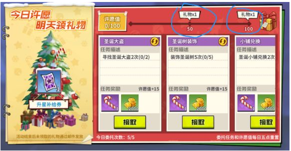 注:选的礼物是有愿望值的,如果你没达到,那就没了,并且如果你做5个橙色任务,根据字面意思是礼物X2。因为今天第一天,没有实测,具体情况也不得而知。