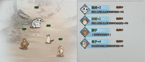 至于以上的猴子目前加成还在制作呢,所以就没有发出来,大家可以看出来,宠物的加成不同代表了你所编队的侠客系别,灵活使用宠物助战才可以更容易取胜哟。