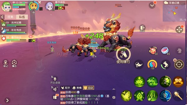 此外,任务中获得的道具“爆竹”,可以用来对付年兽王;使用爆竹之后,从年兽王身上将即时掉落更多的奖励哦。
