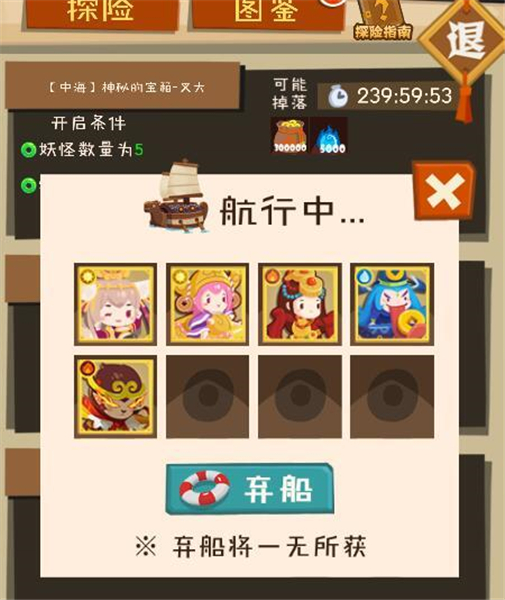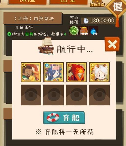 根据探险指南,需要献祭素材来增加开船探险的时间,时间必须大于1小时。当你有妖怪闲置在仓库的时候,就可以考虑来开船得到想要的金币、魂、素材。当然,开船都需要条件,只有当触发到了这个条件,才可以发动这艘船能得到的特定的东西。(简单来说就是:用不需要的素材和饭来换需要的素材或者金币。)