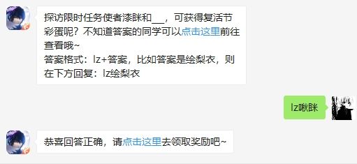 探访限时任务使者漆眯和___,可获得复活节彩蛋呢?不知道答案的同学可以点击这里前往查看哦~