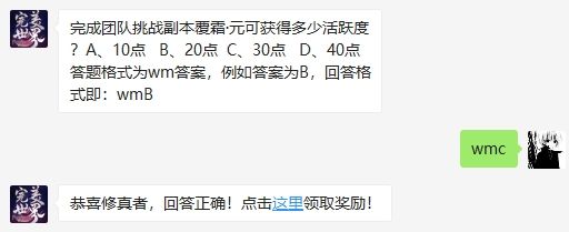 完成团队挑战副本覆霜·元可获得多少活跃度?这是2020年完美世界手游微信公众号4月21日每日一题的问题,各位完美世界手游玩家知道这个问题的答案吗?答对可以在完美世界手游微信公众号中进行抽奖,不清楚答案的玩家来看看吧!