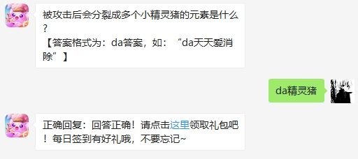 被攻击后会分裂成多个小精灵猪的元素是什么?2020年天天爱消除5月11日微信每日一题答案:被攻击后会分裂成多个小精灵猪的元素是什么?这是2020年天天爱消除5月11日微信每日一题的问题,答对可获得天天爱消除每日一题幸运扭蛋机抽奖资格,可获得积分、金币和宠物等好礼,大家知道今天的答案吗?下面小编就为大家带来了答案,一起来看看吧!