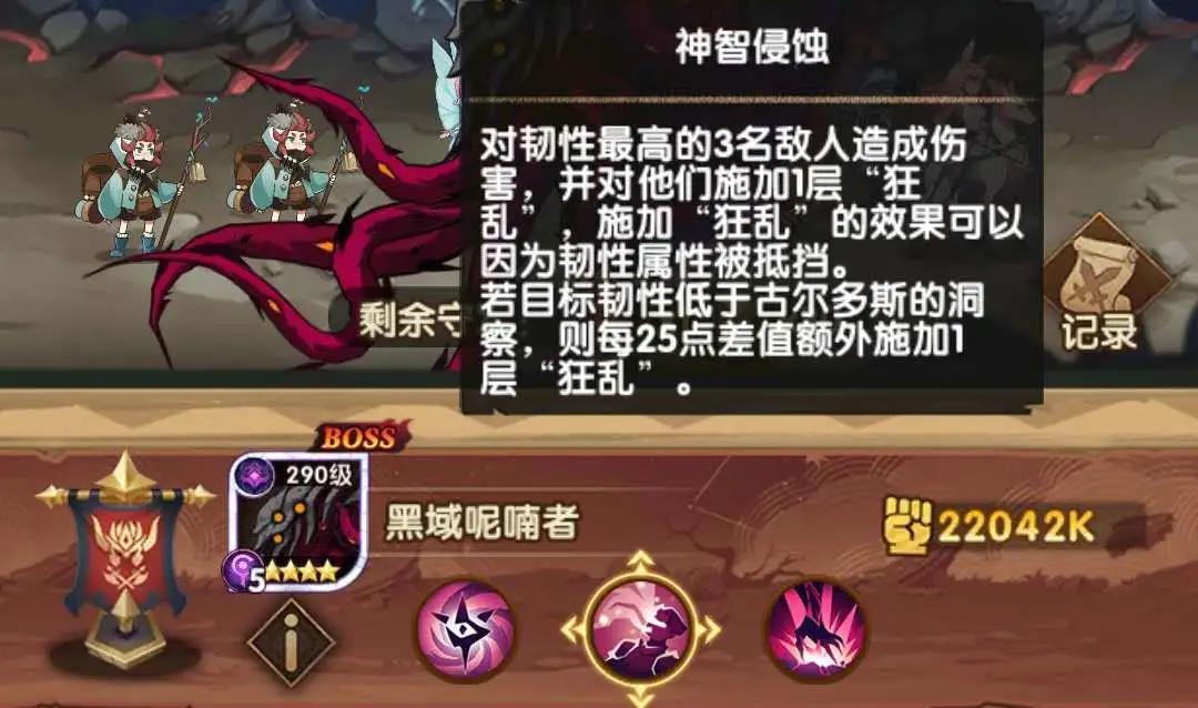 章鱼技能如图所示,因为大招的存在避免过早的5层狂乱丧失战斗力,因为二技能的存在需要提高韧性属性,且能够控制最高韧性角色。