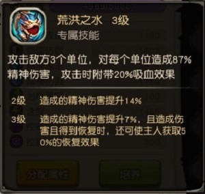 专属技能1【荒洪之水】:攻击敌方3个单位,对每个单位造成87%精神伤害,攻击时附带20%吸血效果。