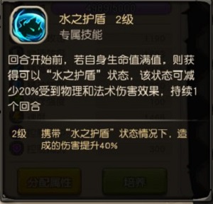 专属技能2【水之护盾】:回合开始前,若自身生命值满值,则可以获得“水之护盾”状态,该状态可减少20%受到物理和法术伤害效果,持续1个回合。