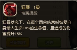 专属技能3【狂暴】:狂暴状态下,在每个回合结束时恢复自身最大生命10%的生命值,且造成的伤害提升15%