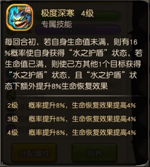 专属技能4:【极度深寒】:每回合初,若自身生命值未满,则有16%的概率使自身获得“水之护盾”状态,若生命值已满,则使己方其他1个目标获得“水之护盾”状态,且“水之护盾”状态下额外提升8%生命恢复效果