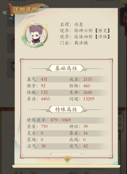 2) 点击标签“详情”,玩家可查看自身的详细属性