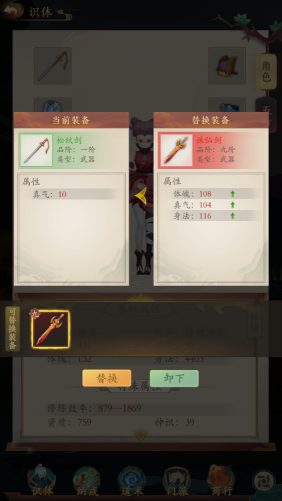 3)点击装备栏位,玩家可自行穿戴或替换装备以获得角色四围属性的提升