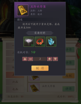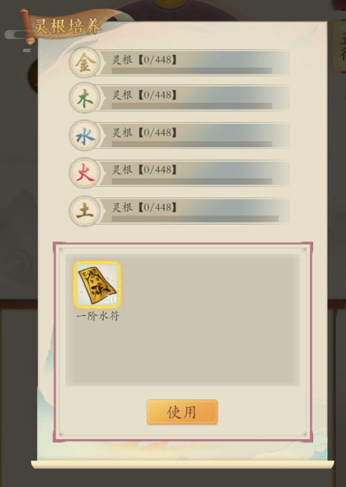 2)点击按钮“升级”,玩家可选择对应的五行灵根进行培养操作;消耗对应符箓可提升灵根值