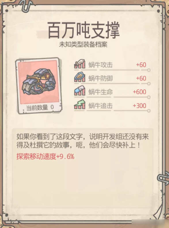 百万吨支撑为蜗牛提供了巨额的移动速度加成,使得蜗牛的跑图效率更高了,是全阶段都能用上的优良装备,相对于海上霸主的固定收益,百万吨支撑的收益也兼顾随机性,毕竟谁也不知道,下一趟探索,出来的是十来颗龙珠还是七八根檀香(该醒醒了!)