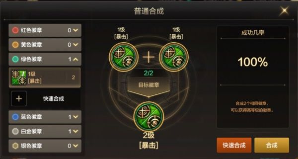 两个同色的低等级徽章进行两两合成,合成以后变为下一等级的徽章,随着等级的提升,合成为下一等级徽章的概率也随之降低。