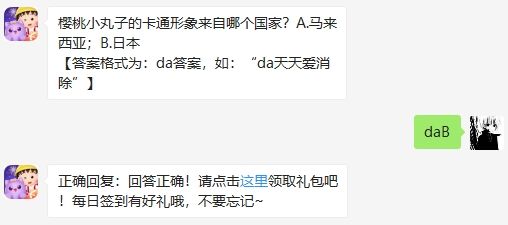 樱桃小丸子的卡通形象来自哪个国家?天天爱消除2020年8月9日微信每日一题答案:樱桃小丸子的卡通形象来自哪个国家?这是2020年天天爱消除8月9日微信每日一题的问题,答对可获得天天爱消除每日一题幸运扭蛋机抽奖资格,可获得积分、金币和宠物等好礼,大家知道今天的答案吗?下面99安卓网小编就为大家带来了答案,一起来看看吧!