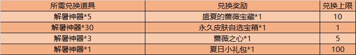 参与三分夏日之蔷薇珍宝阁系列活动,通过累计登录、每日对局、乘风破浪收集活动道具解暑神器,解暑神器可用来免费兑换盛夏的蔷薇宝藏(几率得内测皮肤)、蔷薇之心、永久皮肤自选宝箱等奖励!(商城特惠将在8月18日~8月23日开启售卖,每人限购解暑神器*6,每个售价钻石*60。)