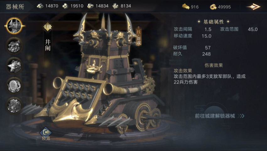 游戏提供“井阑”、“投石车”、“弩车”、“战鼓”、“盾车”等多种器械,供广大玩家应对不同情况。其中,“井阑”器械提供范围伤害,其作用不可小视;阵容如果缺少输出,他可以充当一个额外的输出位;如果缺少前排,可以暂时充当一个前排位。而“投石车”则可以配合枪兵拆迁队,能大幅提高队伍的拆迁值,可谓是在攻城战中不可或缺的器械。
