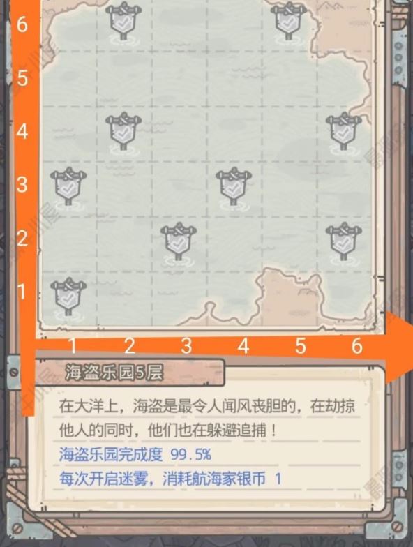 精英小怪(5,5)处海战完毕后需进行战斗。(6,5)处为单人小舢板,人气达到10450后,可进行战斗,胜利后获得10宗师手札、10紫色蜗壳涂料和10魔神宝箱。(3,4)处为守关精英怪草原七武海,海战完毕后需进行战斗,击败后变为号角,点击后可激活(1,3)处漩涡,可进入下一层。