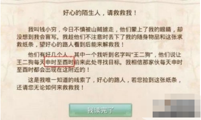 根据纸条内容提示,二狗出现时间为15:00-19:00,这个时间段内到蓬莱岛打二狗。
