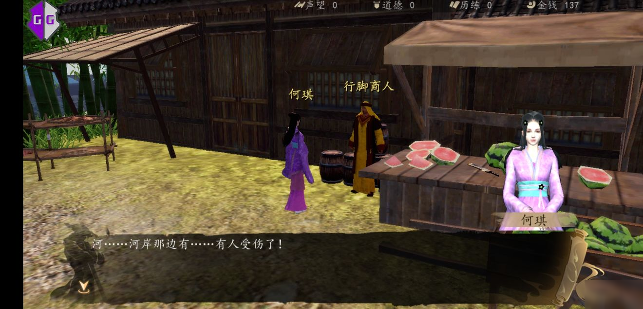行脚商人后面有宝箱,金创药。
